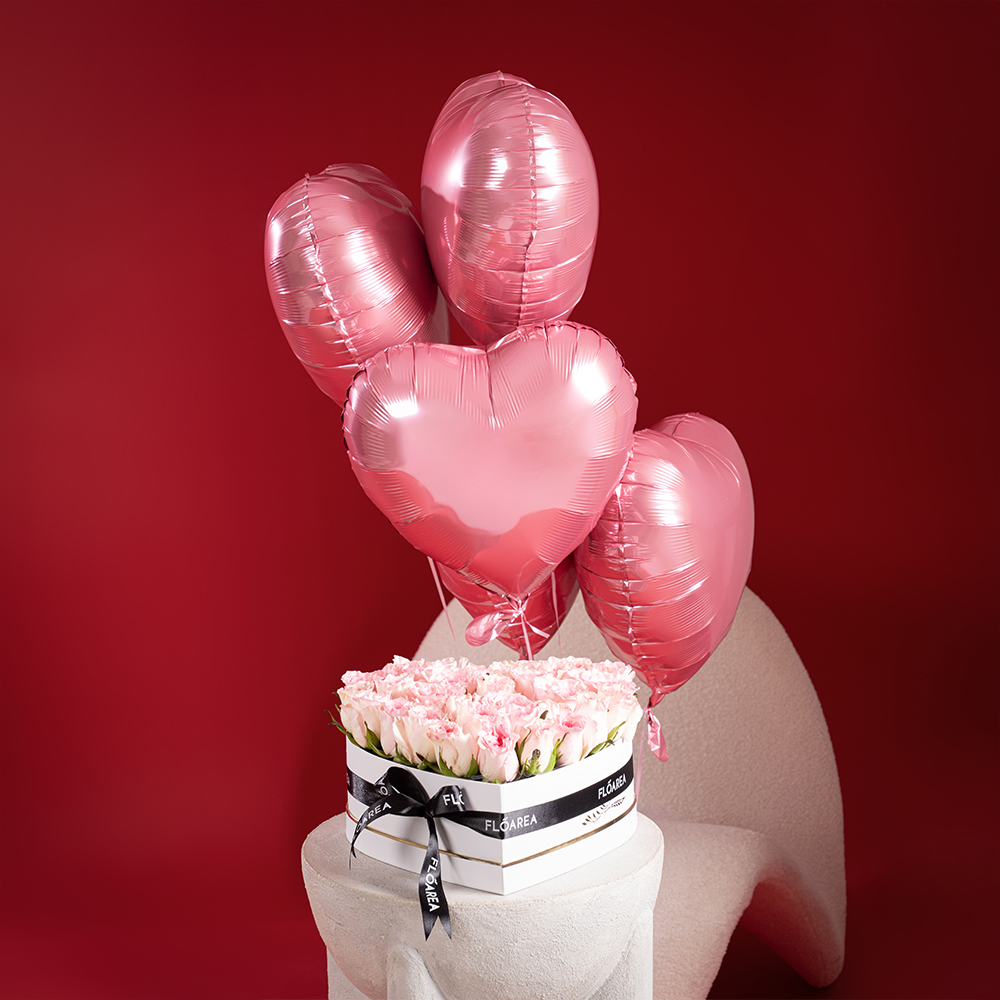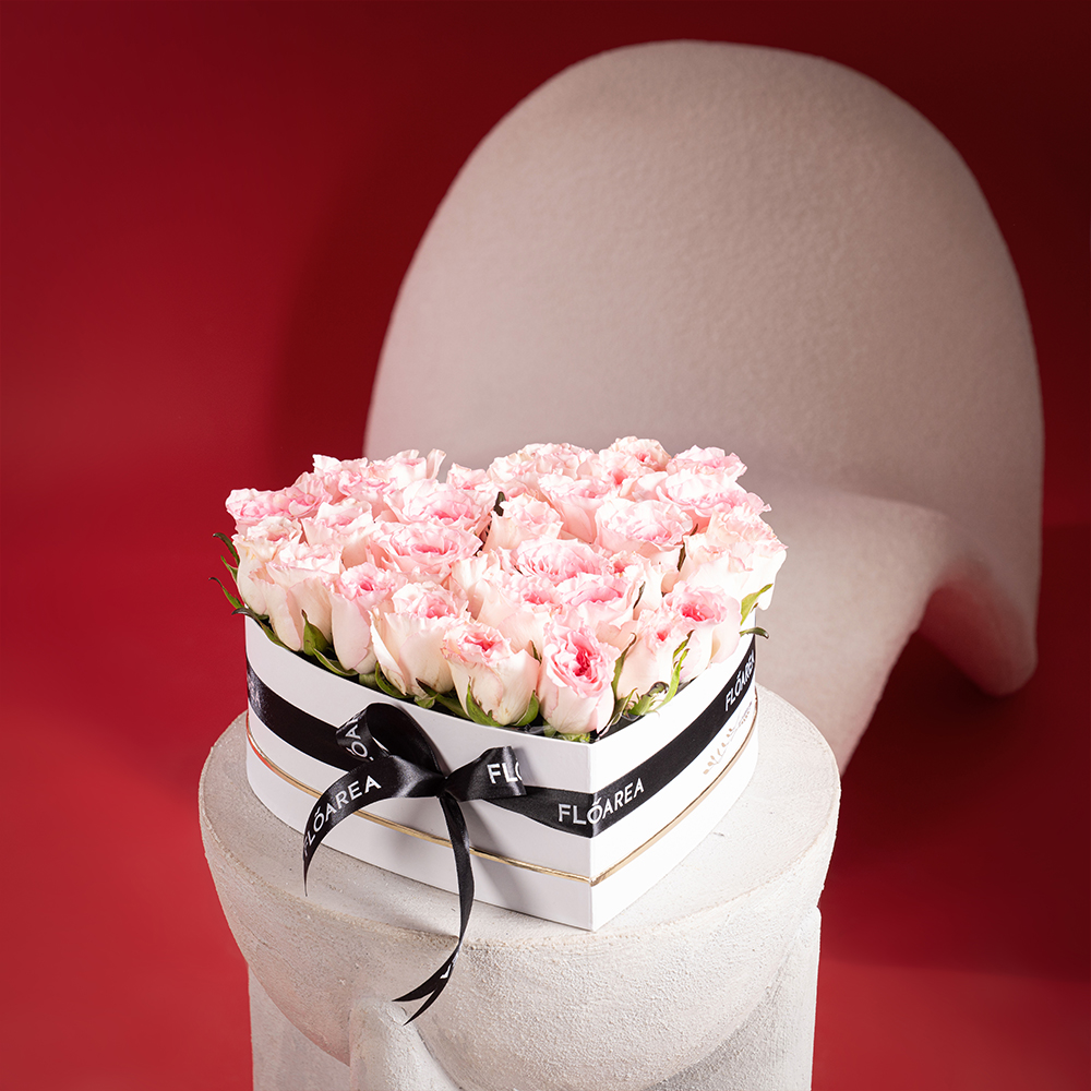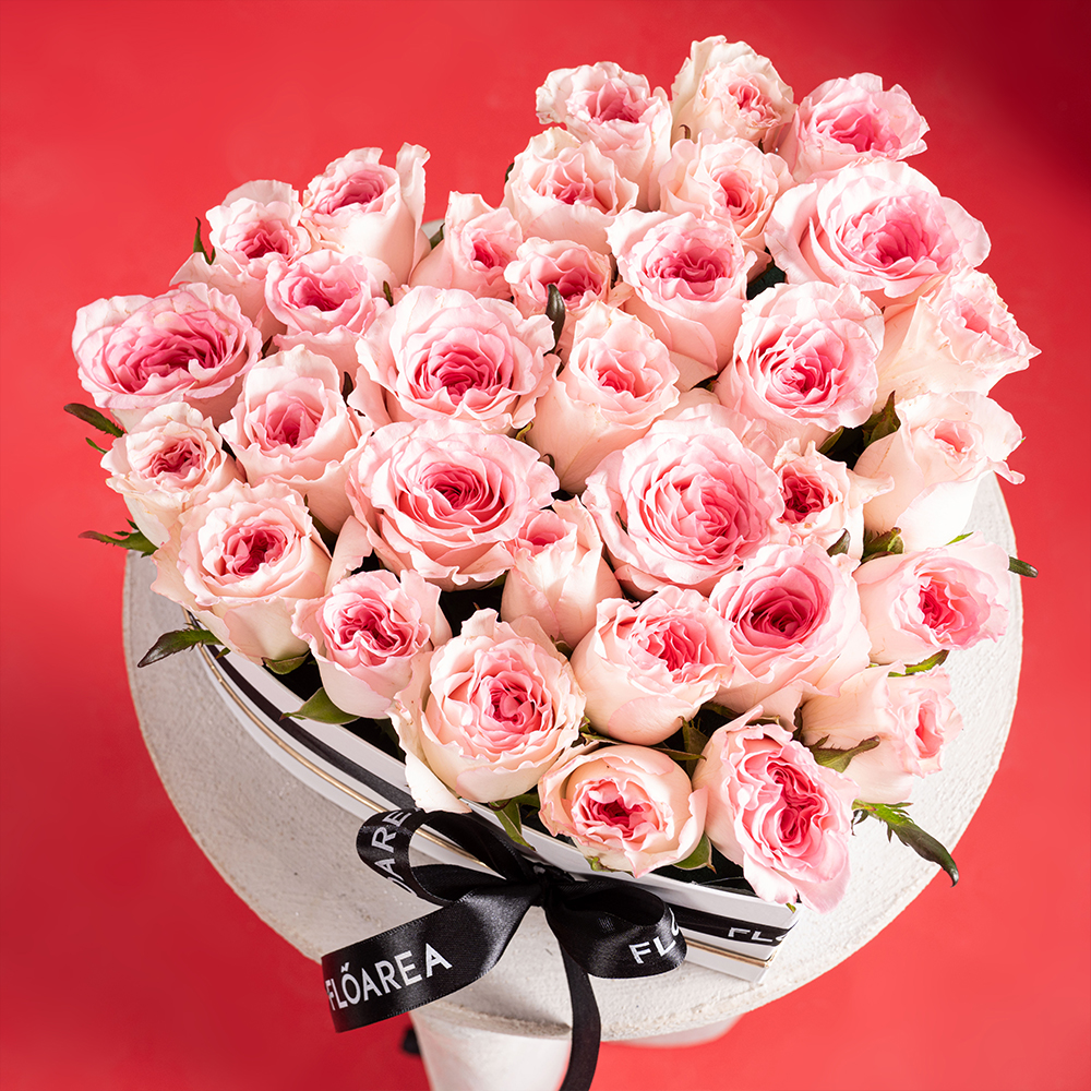 A charming heart-shaped arrangement featuring 30 premium pink roses, beautifully arranged in FLOAREA’s signature white heart box and finished with an elegant black ribbon. Soft, sweet, and romantic — a perfect Valentine’s gift for a delicate expression of love.