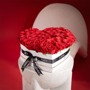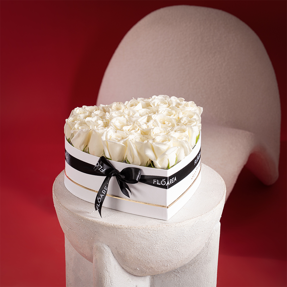 A delicate heart-shaped arrangement featuring 30 premium white roses, elegantly presented in FLOAREA’s signature white heart box and finished with a refined black ribbon. Pure, graceful, and timeless — a beautiful Valentine’s gift that speaks of sincere love and elegance.