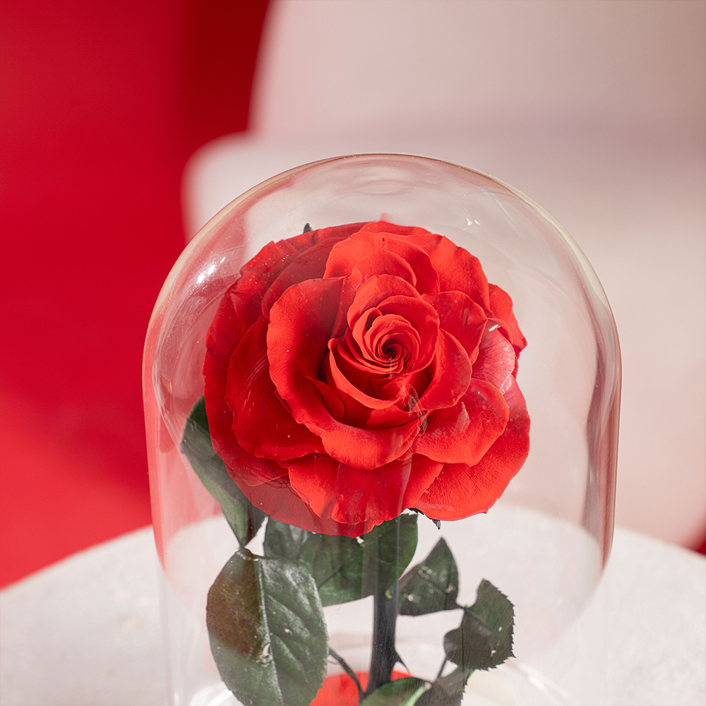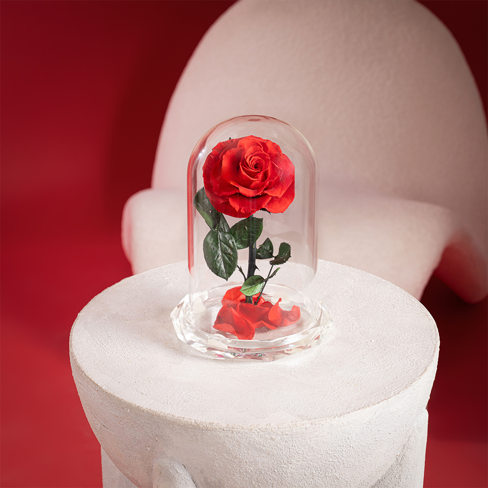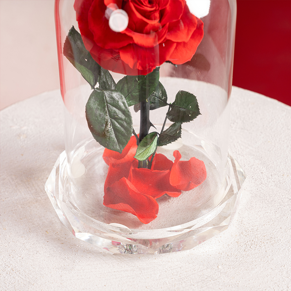 A refined single preserved red rose, beautifully displayed under a crystal-clear glass dome with a faceted base. Designed to last up to 5 years with no water or maintenance, this timeless piece is a symbol of everlasting love and elegant simplicity.