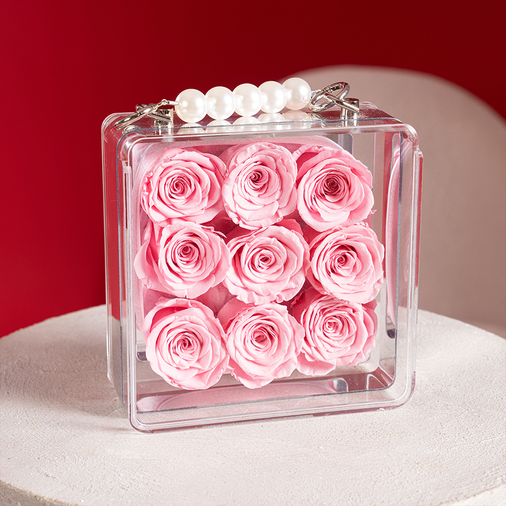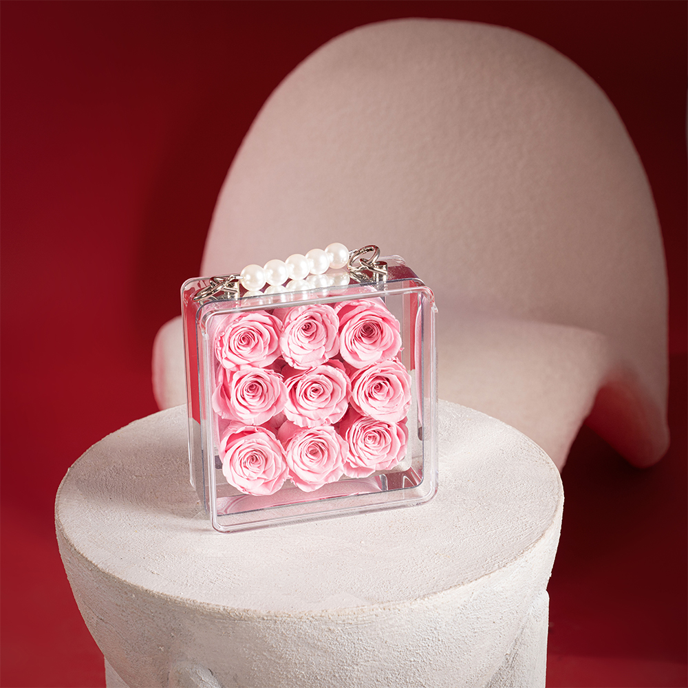 A delicate arrangement of preserved pink roses, beautifully presented in a transparent mini bag with a pearl handle. Designed to last up to 5 years, this elegant piece requires no water or maintenance, making it a timeless keepsake and a modern statement gift.