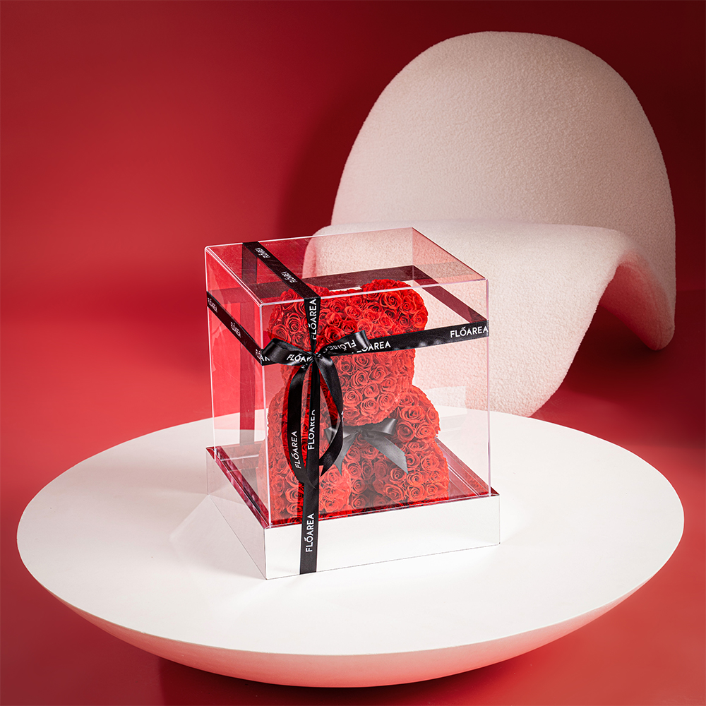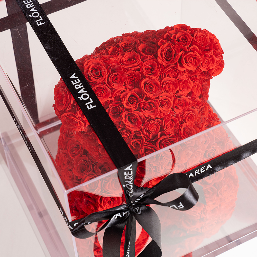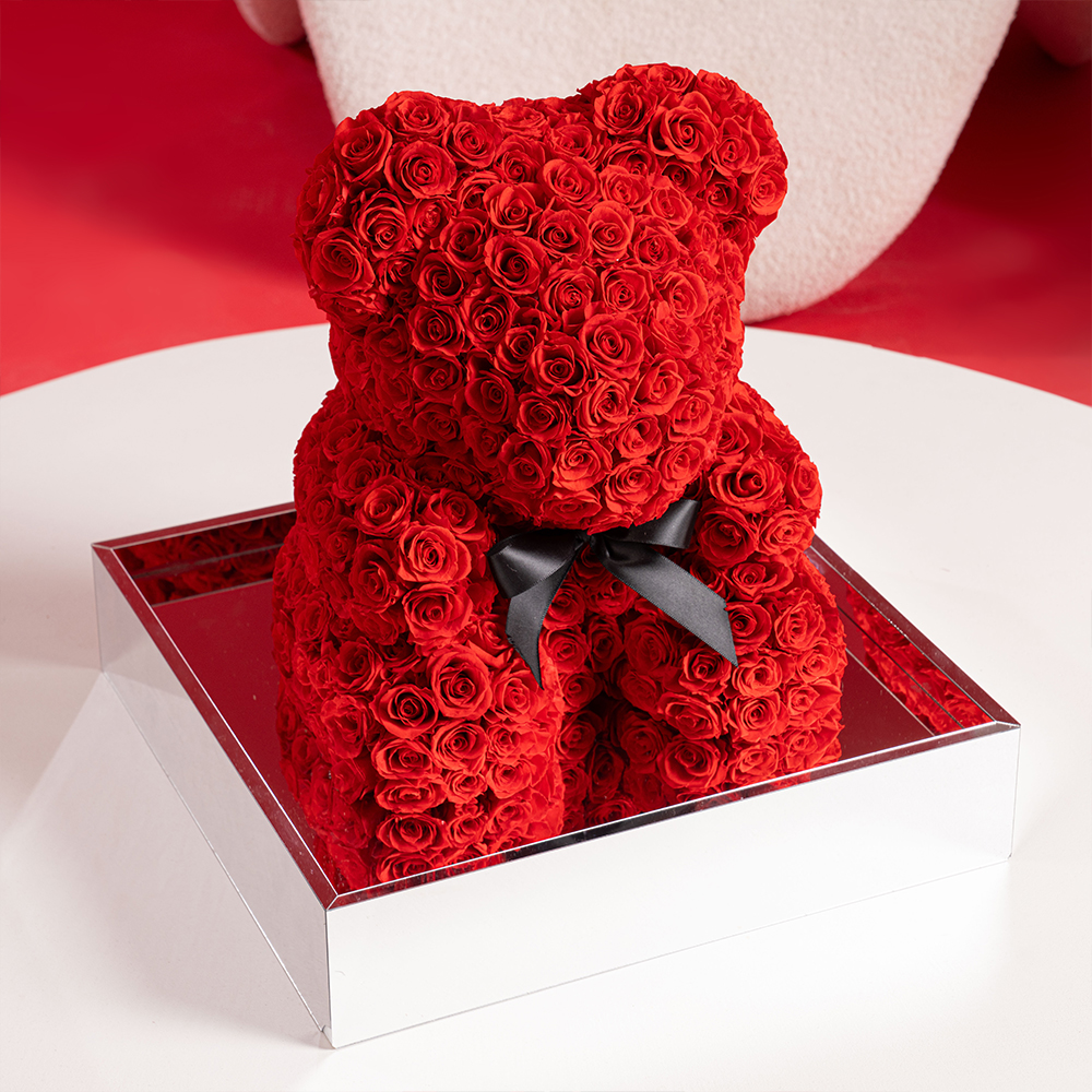 The Preserved Rose Teddy Bear is a charming expression of everlasting love, handcrafted entirely from premium preserved red roses. Designed in an iconic teddy bear shape and presented in a sleek mirrored display box, this piece blends romance with luxury.