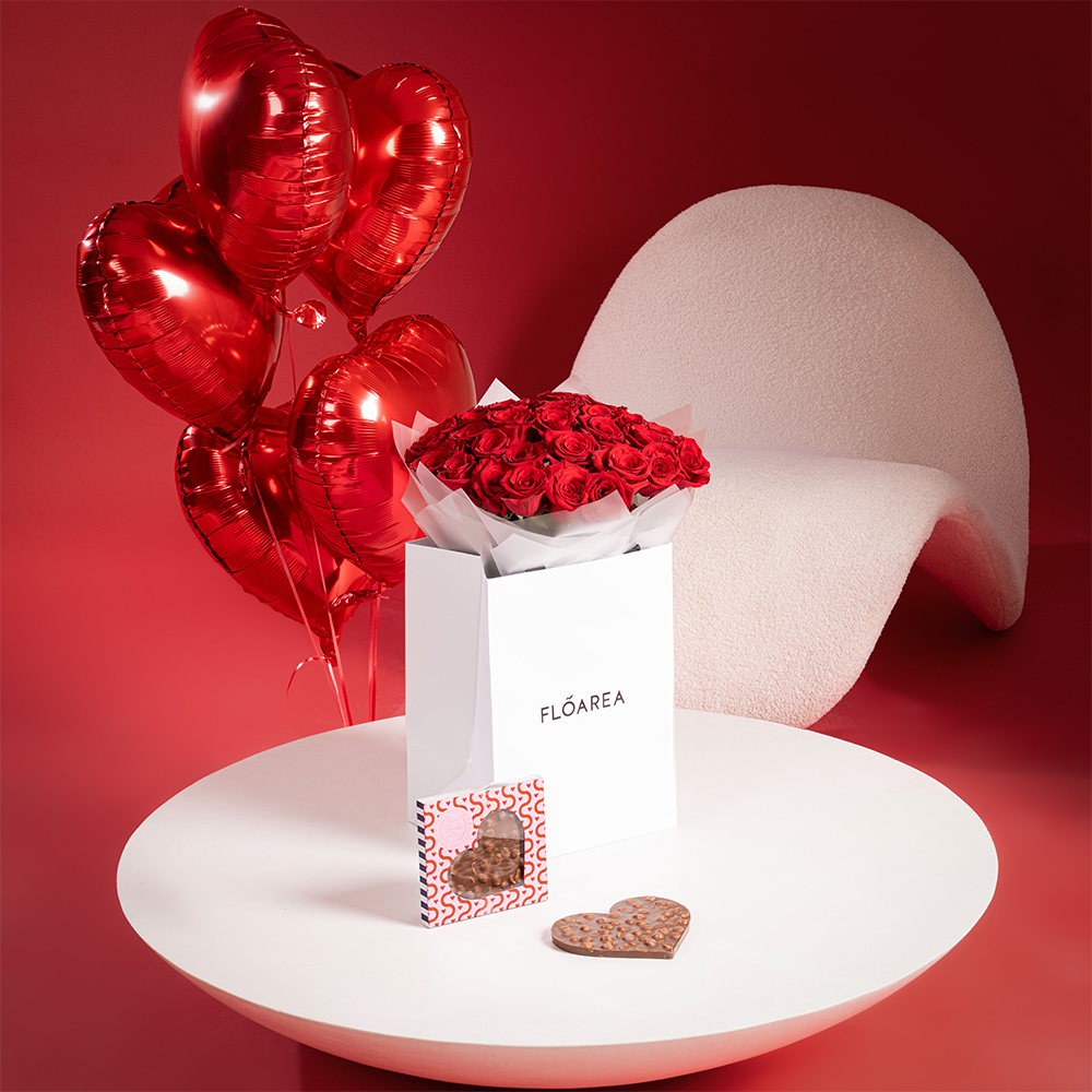 This luxurious bundle features a stunning 30-red-rose bouquet, paired with 5 heart-shaped balloons and premium Venchi Heart Milk Chocolate With Hazelnut.