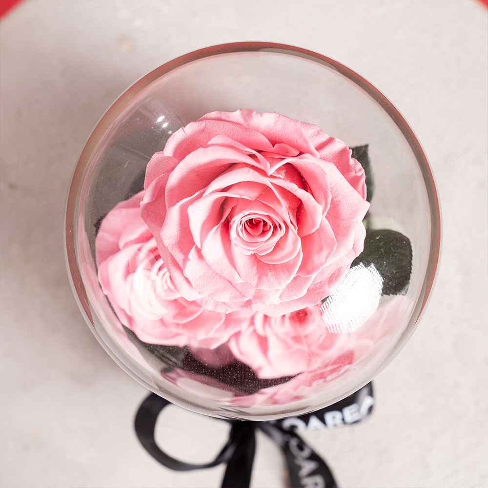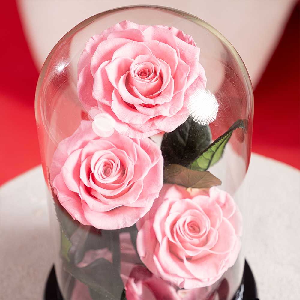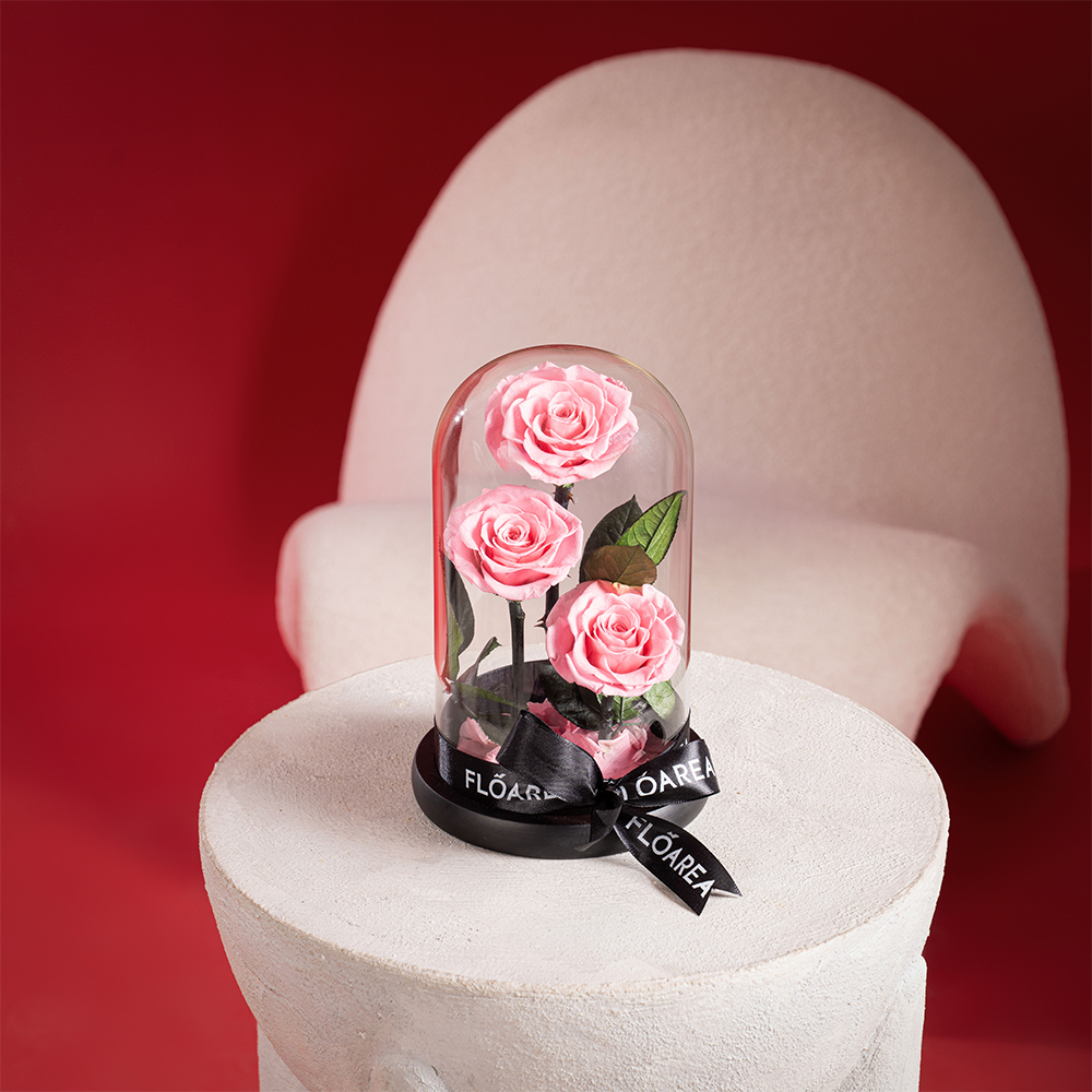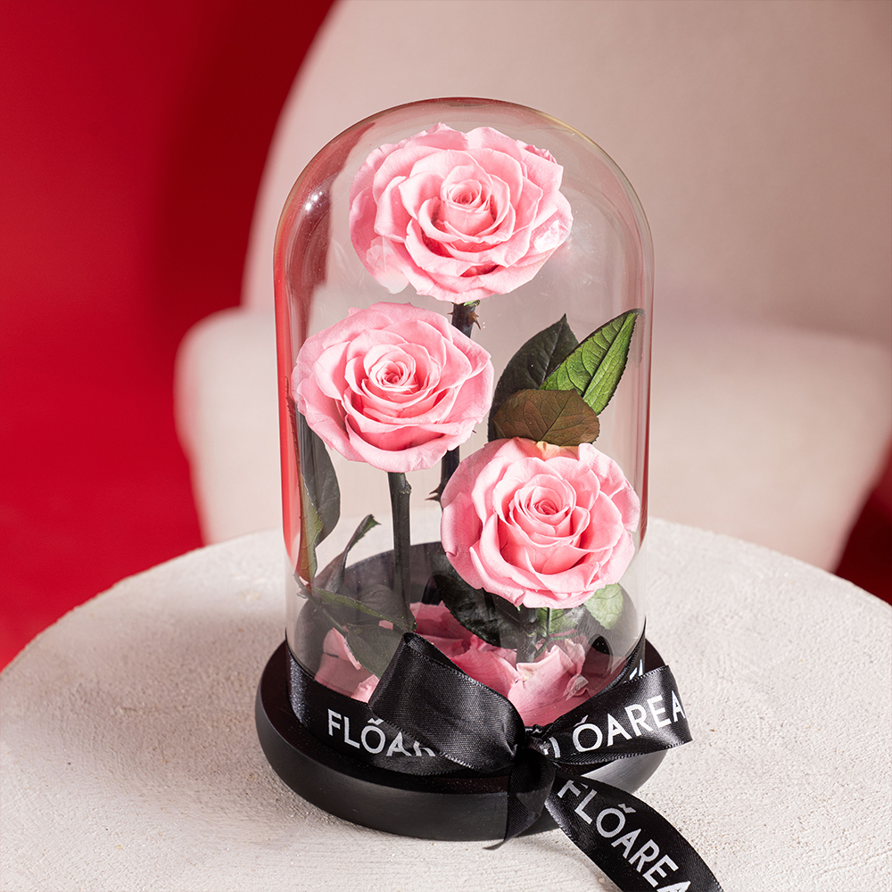 A refined arrangement of three preserved pink roses, beautifully displayed under a clear glass dome with a sleek black base. Designed to last up to 5 years with no water or maintenance, this elegant piece represents balance, affection, and timeless love.